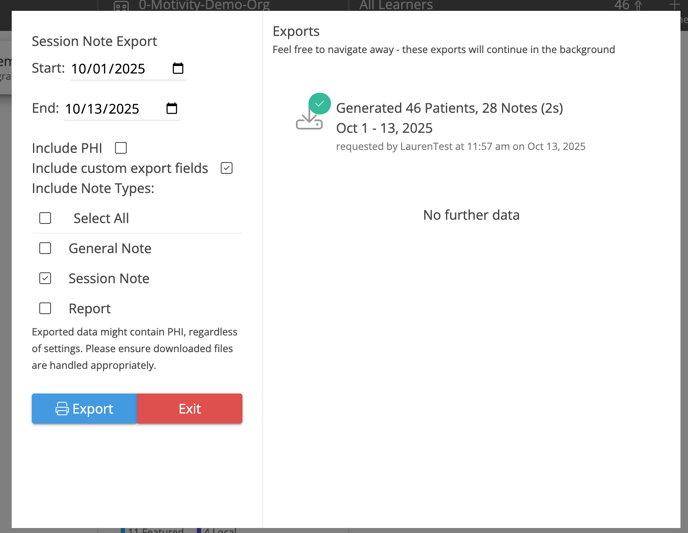 - "Session Notes" will generate a zip file containing PDF versions of each session note from the listed timeframe.