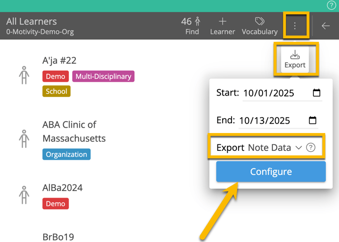 - "Note Data" will create 1 row for each signed session note. This can be exported for an entire organization, or at the learner level. Importantly, you can choose to include additional fields from your session note templates in this export. To learn how to do this, see our article here.