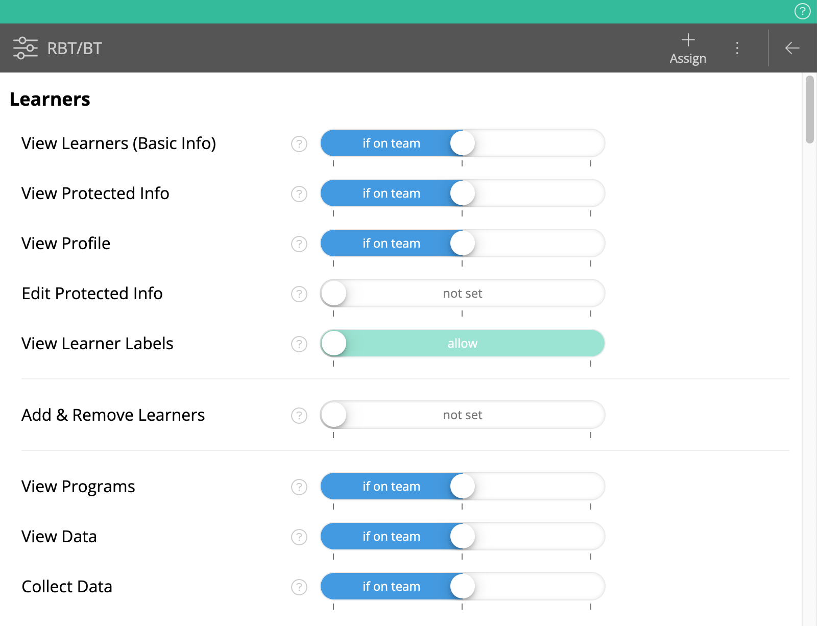 Slide the ball across the bar to set levels of permission for each role. You can slide the bar halfway to give the role permission only "if on team" or "if assigned" meaning that they only have this permission only if they are assigned to that learner's team. See Assign members to a team article to learn how to assign members to a learner's team.