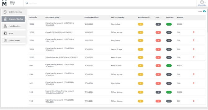 Unposted batches is an important section which shows you how many invoices were created based on your selection of unbilled services in the previous step versus how many invoices were not created due to errors identified in the claims data.