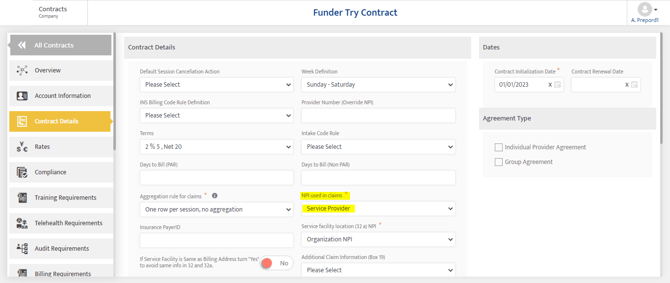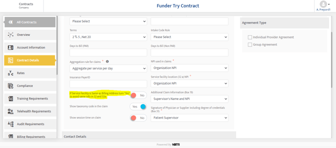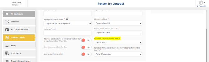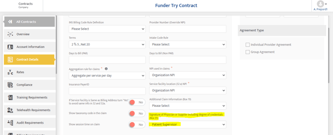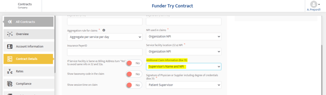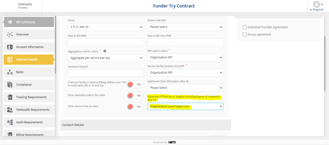 When Contracts>Contracts Details>Contracts Details>Signature of Physician or Supplier including degree of credentials (Box 31) = Organization Level Supervisor Then Admin->Organization Details>Organization Details>Name of supervisor or provider including degrees or credentials |