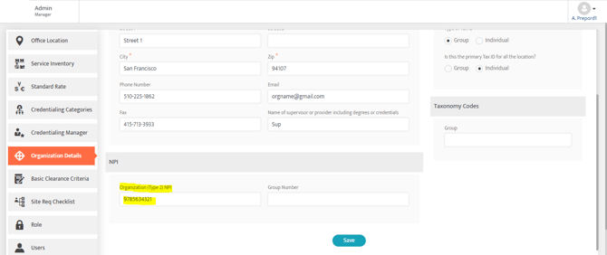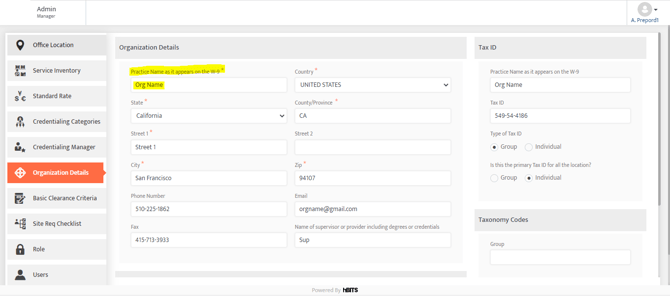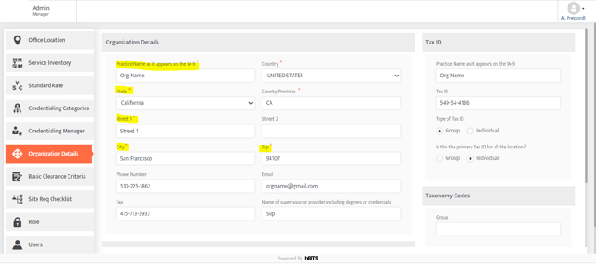 How to Fix: Navigate to Admin > Organization Details > Organization Details > Practice Name, Group NPI, Address.