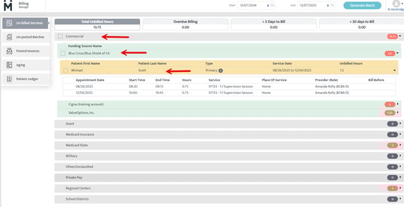 Each funding source — including commercial insurance, Medicaid, and private pay— is displayed, along with the number of unbilled services. Selecting a funding source allows you to drill down into specific contracts, payors, and patient data, showing the unbilled hours and service dates.