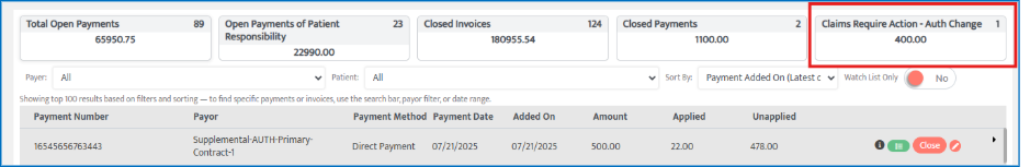 If there is a failed transfer, an alert appears in the Collections Module, identifying claims that request action.