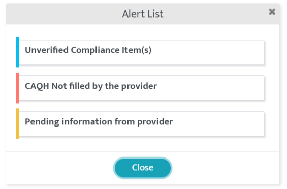 Reason: Provider’s one or more compliance items have expired. Once the provider adds the renewed details or this item is marked as ‘Not being added’ then this alert will be removed automatically.