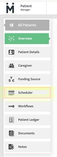 When navigating the patient profile, you can access the patient's schedule by clicking on the scheduler located within the menu option on the left-hand side of the screen. This action will redirect you to the patient scheduler view.